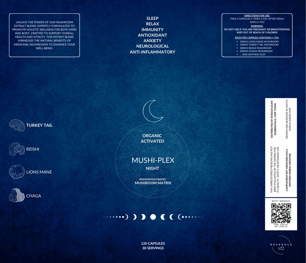 A specially formulated 4 medicinal mushroom blend, crafted specifically for night time use to enhance sleep quality, reduce anxiety and support overall mental and body wellness. The goodness is packed into veg capsules for your convenience and suggested daily intake.